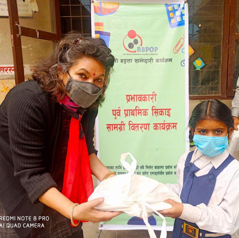 RBPOP distributed packets to 2,385 primary students and 1,000 EC students of 22 community schools in Lalitpur. These are the RBPOP partner schools where RBPOP is working on school culture and leadership, experiential learning skills, early childhood development, building child-friendly practices, and more. Each packet includes Nepali and English storybooks, pencils, erasers, Math and Language exercise books, sharpeners, and two reusable cloth masks for each child. The books will ultimately go back to the school libraries. Also, we distributed the playing materials like shape stacks, shape boxes, puzzles, and dice to each EC class.